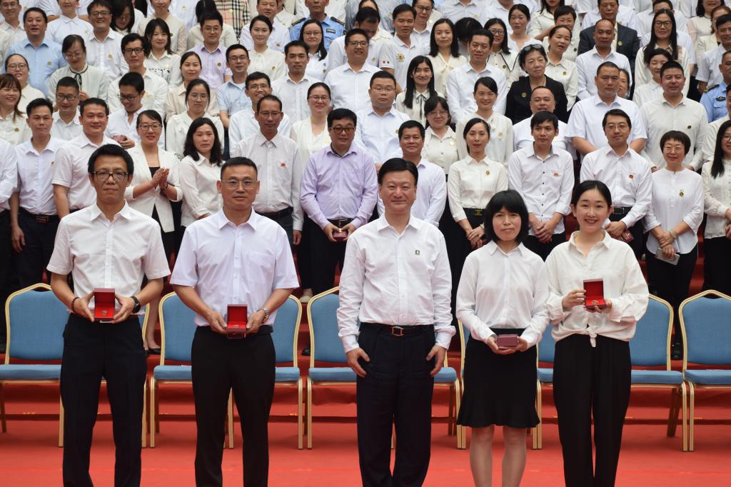 受表彰的235位教職工分19批次上臺,張亞斌、蔣新華、黃學茭等公司、學校領(lǐng)導(dǎo)為他們頒發(fā)金質(zhì)紀念章并合影留念。
