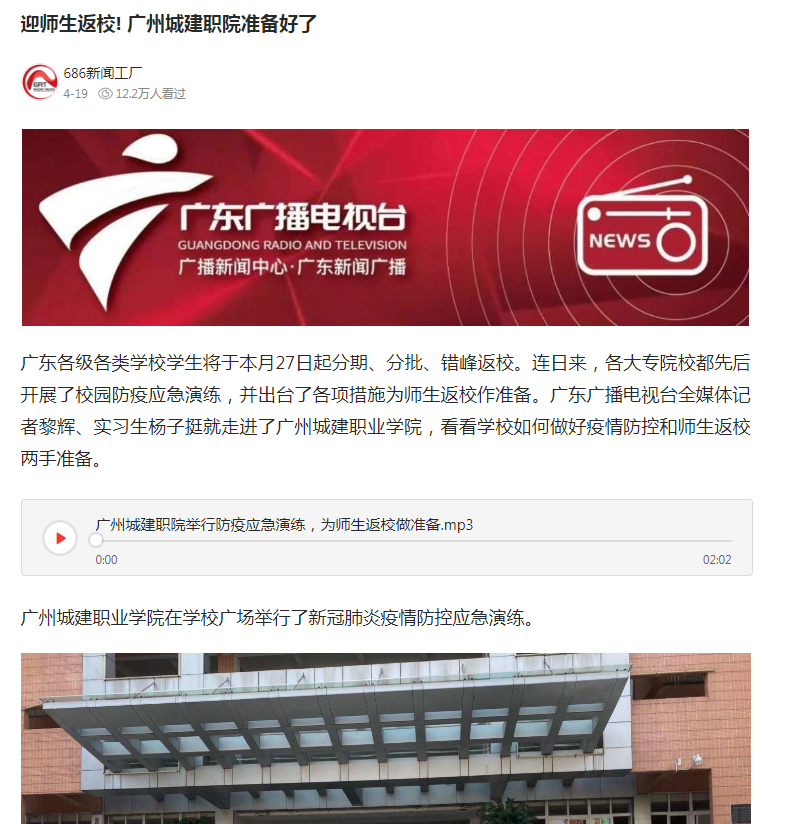 《廣東新聞廣播》:迎師生返校! 廣州城建職院準備好了