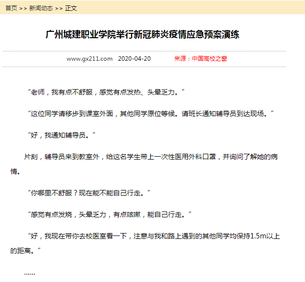 《中國高校之窗》:廣州城建職業(yè)學(xué)院舉行新冠肺炎疫情應(yīng)急預(yù)案演練