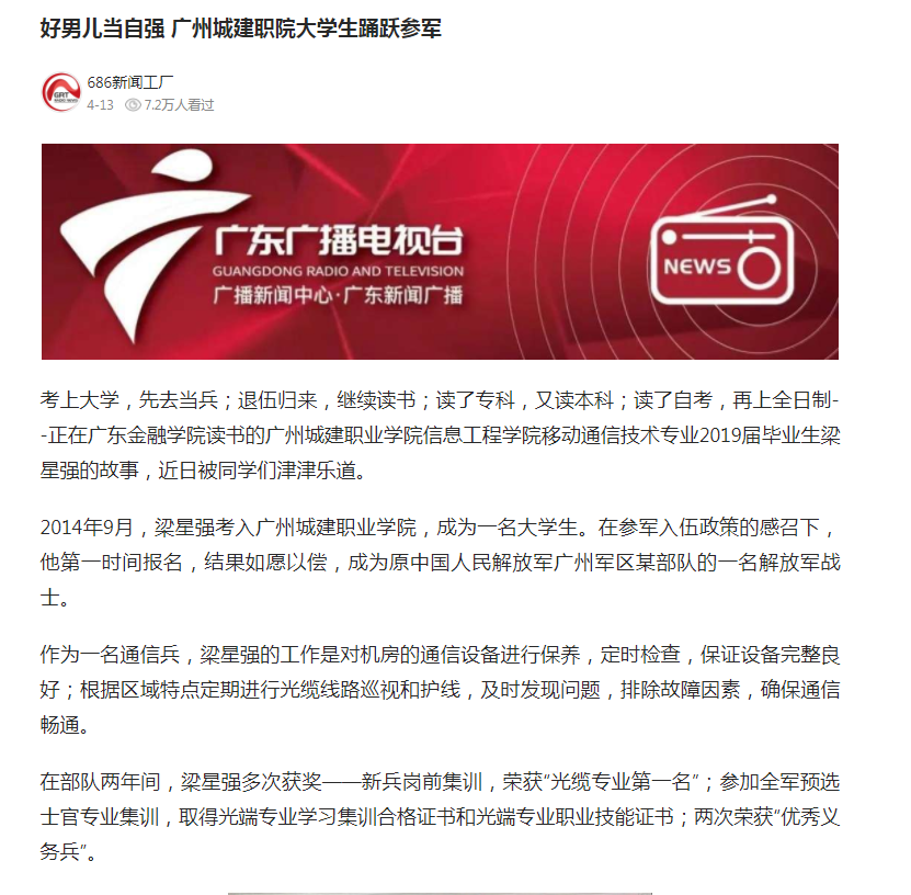 《廣東新聞廣播》:好男兒當自強 廣州城建職院大學生踴躍參軍