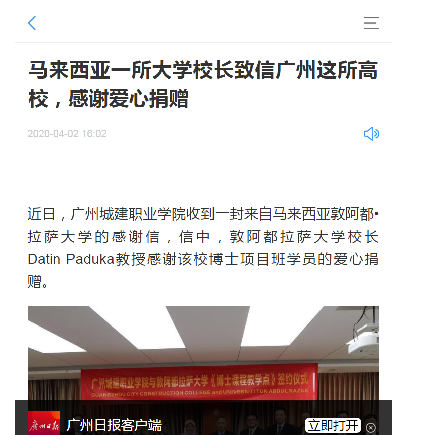《廣州日報》:馬來西亞一所大學(xué)校長致信廣州這所高校,感謝愛心捐贈