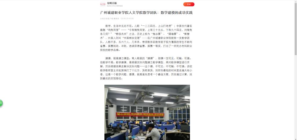 9月16日—19日,2015年高教社杯全國大學生數(shù)學建模競賽舉行,30?。ㄊ?、自治區(qū))795所院校的8492隊參加,廣州城建職業(yè)學院參賽團隊學生徐繼明、古旭鵬、賴晶獲得全國二等獎,指導教師為“數(shù)學建模組”。此前,他們獲得廣東賽區(qū)一等獎。2016年,數(shù)學教研室又獲得省賽一等獎,國賽二等獎。2017年,數(shù)學教研室實現(xiàn)重大突破,拿到6個省賽一等獎、1個國賽一等獎。