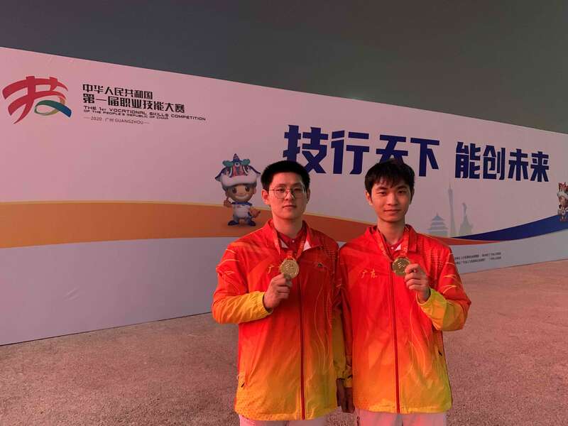 林怡峰(左)在2020年全國第一屆職業(yè)技能大賽中榮獲混凝土建筑項(xiàng)目金牌。