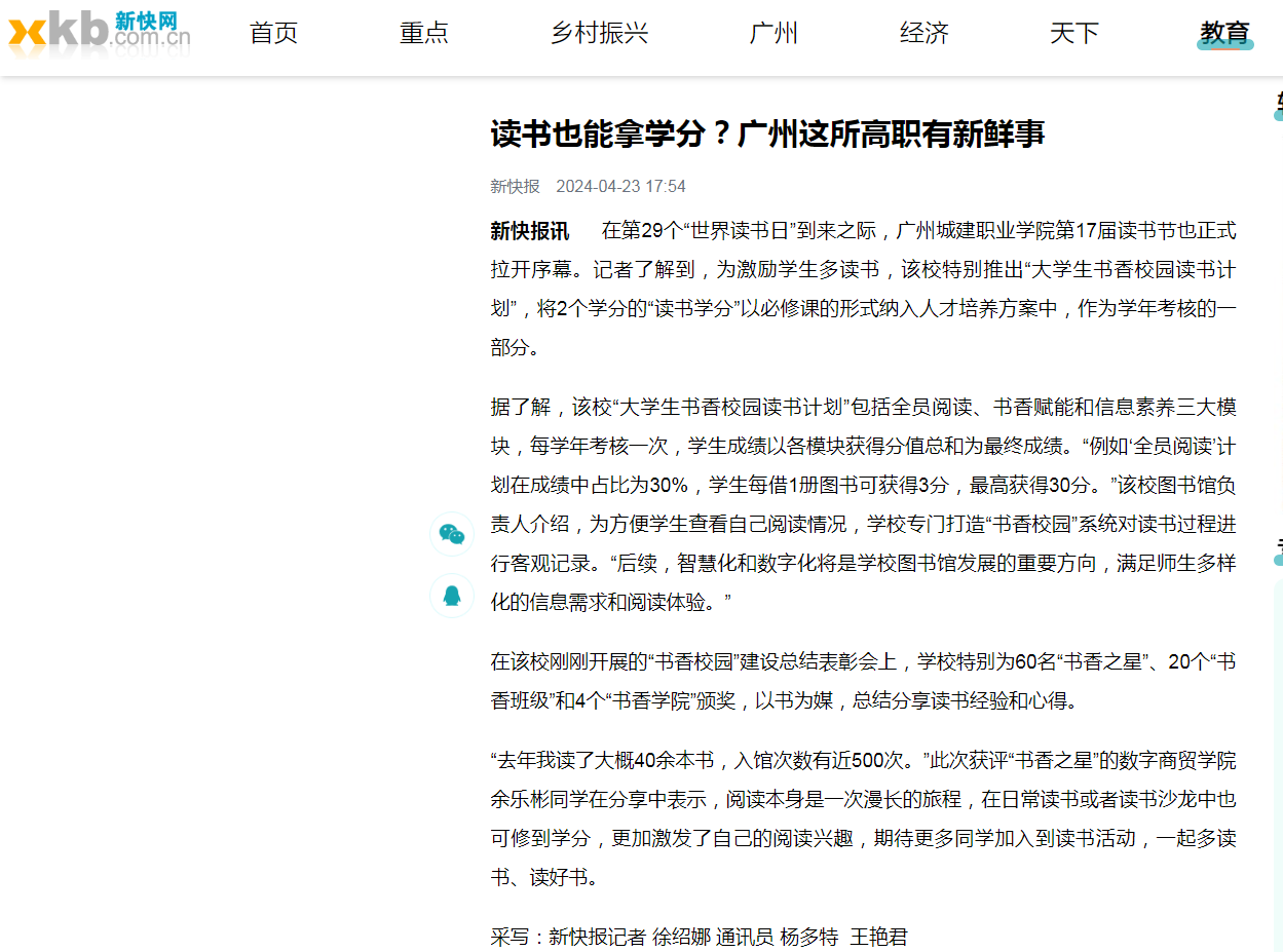 在第29個“世界讀書日”到來之際,廣州城建職業(yè)學(xué)院第17屆讀書節(jié)也正式拉開序幕。記者了解到,為激勵學(xué)生多讀書,該校特別推出“大學(xué)生書香校園讀書計劃”,將2個學(xué)分的“讀書學(xué)分”以必修課的形式納入人才培養(yǎng)方案中,作為學(xué)年考核的一部分。