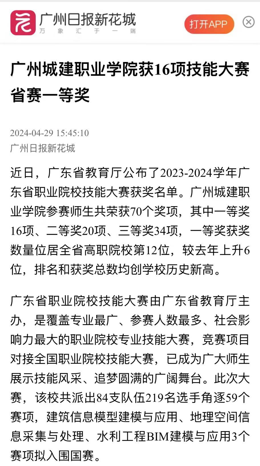 近日,廣東省教育廳公布了2023-2024學(xué)年廣東省職業(yè)院校技能大賽獲獎(jiǎng)名單。廣州城建職業(yè)學(xué)院參賽師生共榮獲70個(gè)獎(jiǎng)項(xiàng),其中一等獎(jiǎng)16項(xiàng)、二等獎(jiǎng)20項(xiàng)、三等獎(jiǎng)34項(xiàng),一等獎(jiǎng)獲獎(jiǎng)數(shù)量位居全省高職院校第12位,較去年上升6位,排名和獲獎(jiǎng)總數(shù)均創(chuàng)學(xué)校歷史新高。