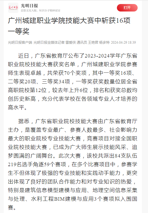職業(yè)院校學生專業(yè)技能大賽是檢驗職業(yè)院校教學質(zhì)量的重要途徑之一。近年來,廣州城建職業(yè)學院聚焦高質(zhì)量發(fā)展,堅持將技能大賽作為高素質(zhì)技術(shù)技能人才培養(yǎng)的重要引擎,構(gòu)建“國家-省-校-院-專業(yè)”五級大賽體系,以學生競賽為重點,以教師競賽為基礎(chǔ),打造高素質(zhì)師生競賽團隊。在人才培養(yǎng)方案中,實施“崗課賽證”融通模式,將競賽賽項與課程體系、賽項標準與課程標準、賽項任務(wù)與教學內(nèi)容、競賽成果與教學資源深入融合,形成一批競賽指導手冊、實操視頻,幫助學生在競賽中檢驗?zāi)芰?、獲得提升,形成具有城建特色的人才培養(yǎng)體系。同時,該校以技能競賽為載體,聯(lián)合企業(yè)共同舉辦校內(nèi)選拔賽,大力弘揚工匠精神,進一步促進產(chǎn)教融合、校企合作,掌握專業(yè)發(fā)展的前沿動態(tài),提升學生就業(yè)競爭力,培育了大批崇尚勞動、精益求精、敢于創(chuàng)新的技術(shù)技能人才。