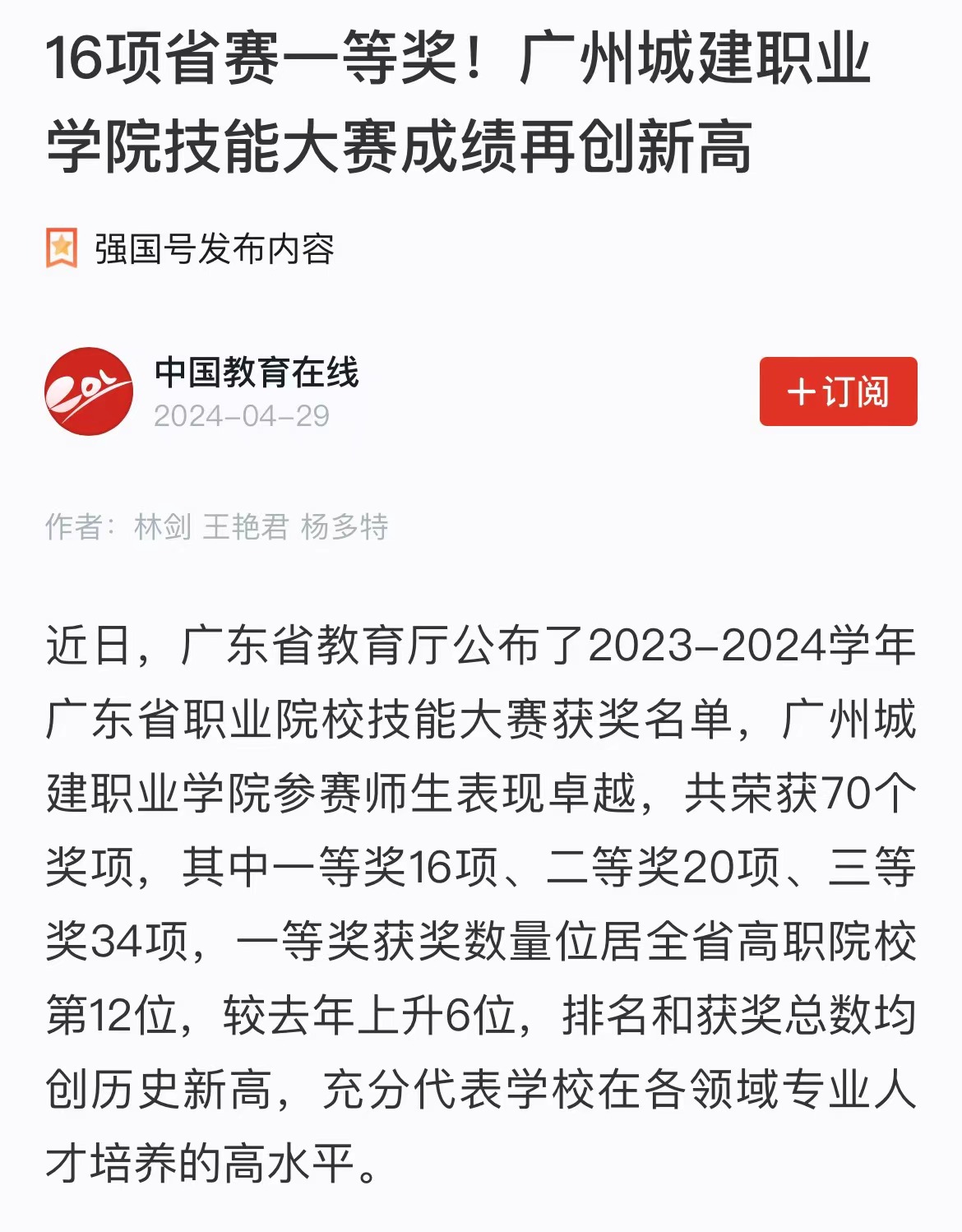 近日,廣東省教育廳公布了2023-2024學(xué)年廣東省職業(yè)院校技能大賽獲獎(jiǎng)名單,廣州城建職業(yè)學(xué)院參賽師生表現(xiàn)卓越,共榮獲70個(gè)獎(jiǎng)項(xiàng),其中一等獎(jiǎng)16項(xiàng)、二等獎(jiǎng)20項(xiàng)、三等獎(jiǎng)34項(xiàng),一等獎(jiǎng)獲獎(jiǎng)數(shù)量位居全省高職院校第12位,較去年上升6位,排名和獲獎(jiǎng)總數(shù)均創(chuàng)歷史新高,充分代表學(xué)校在各領(lǐng)域?qū)I(yè)人才培養(yǎng)的高水平。