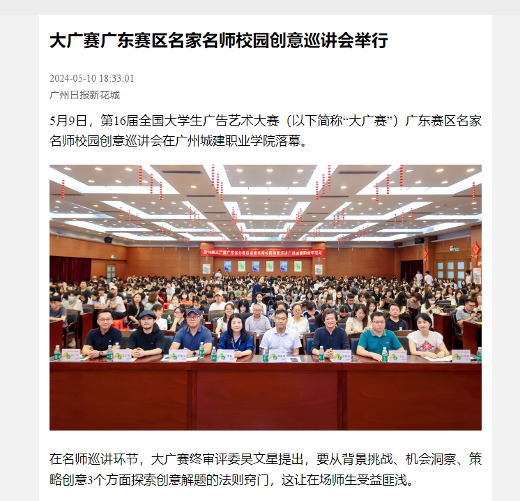 5月9日,第16屆全國大學生廣告藝術大賽(以下簡稱“大廣賽”)廣東賽區(qū)名家名師校園創(chuàng)意巡講會在廣州城建職業(yè)學院落幕。