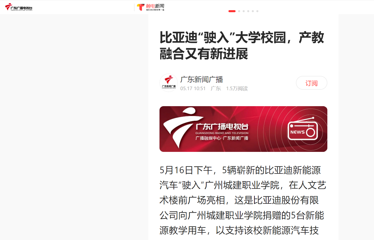 5月16日下午,5輛嶄新的比亞迪新能源汽車“駛?cè)搿睆V州城建職業(yè)學(xué)院,在人文藝術(shù)樓前廣場(chǎng)亮相,這是比亞迪股份有限公司向廣州城建職業(yè)學(xué)院捐贈(zèng)的5臺(tái)新能源教學(xué)用車,以支持該校新能源汽車技術(shù)領(lǐng)域的實(shí)訓(xùn)教學(xué)工作,標(biāo)志著校企合作的“比亞迪現(xiàn)代產(chǎn)業(yè)學(xué)院”建設(shè)取得新進(jìn)展。