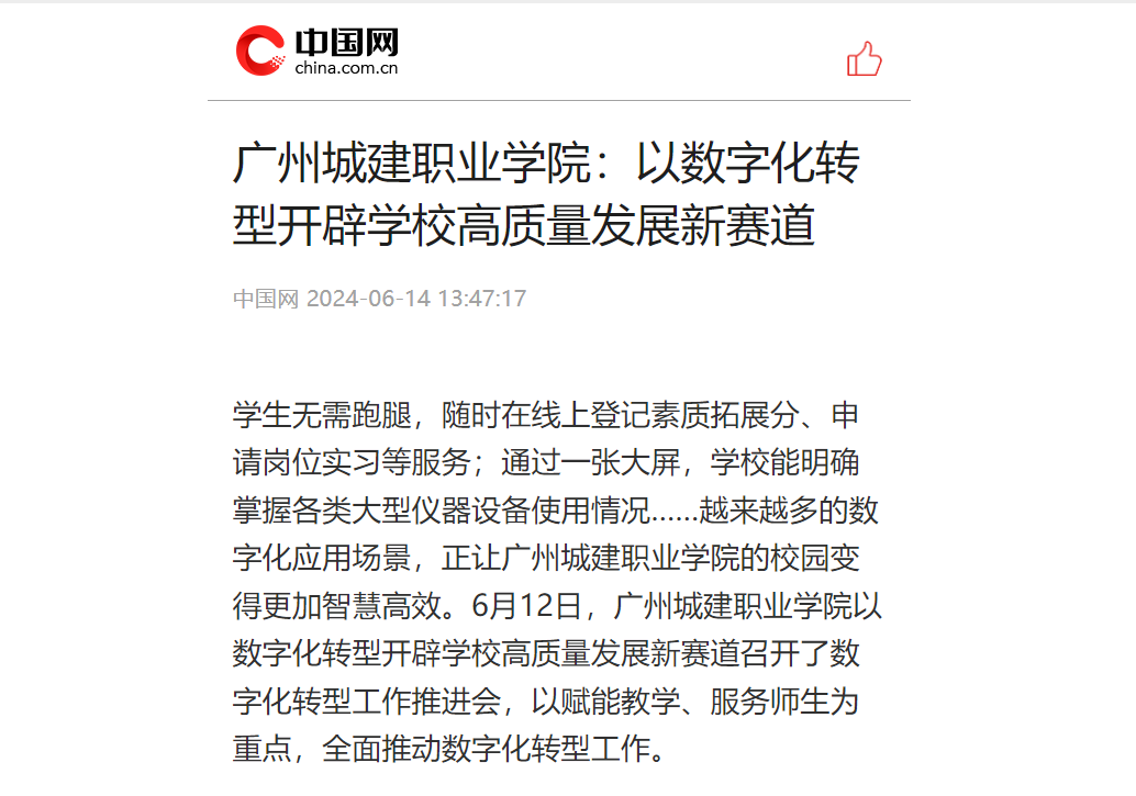 學(xué)生無(wú)需跑腿,隨時(shí)在線上登記素質(zhì)拓展分、申請(qǐng)崗位實(shí)習(xí)等服務(wù);通過(guò)一張大屏,學(xué)校能明確掌握各類(lèi)大型儀器設(shè)備使用情況……越來(lái)越多的數(shù)字化應(yīng)用場(chǎng)景,正讓廣州城建職業(yè)學(xué)院的校園變得更加智慧高效。6月12日,廣州城建職業(yè)學(xué)院以數(shù)字化轉(zhuǎn)型開(kāi)辟學(xué)校高質(zhì)量發(fā)展新賽道召開(kāi)了數(shù)字化轉(zhuǎn)型工作推進(jìn)會(huì),以賦能教學(xué)、服務(wù)師生為重點(diǎn),全面推動(dòng)數(shù)字化轉(zhuǎn)型工作。