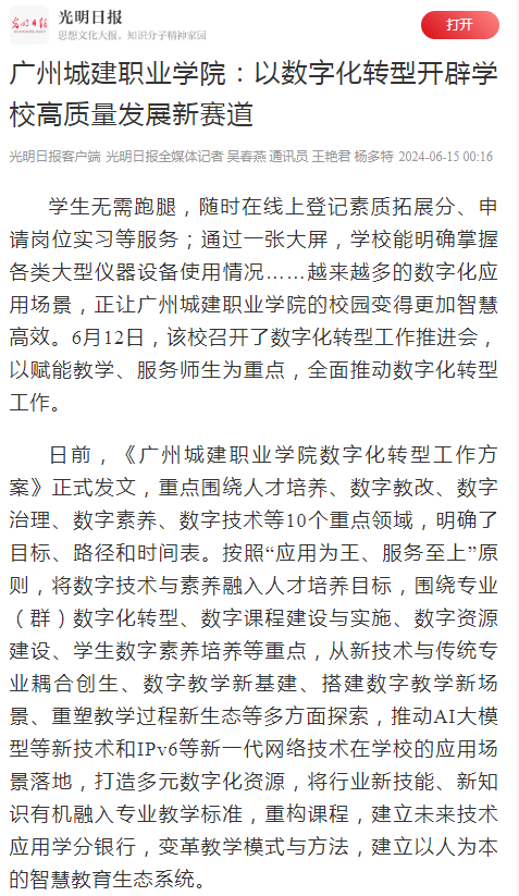 學(xué)生無需跑腿,隨時在線上登記素質(zhì)拓展分、申請崗位實習(xí)等服務(wù);通過一張大屏,學(xué)校能明確掌握各類大型儀器設(shè)備使用情況……越來越多的數(shù)字化應(yīng)用場景,正讓廣州城建職業(yè)學(xué)院的校園變得更加智慧高效。6月12日,該校召開了數(shù)字化轉(zhuǎn)型工作推進會,以賦能教學(xué)、服務(wù)師生為重點,全面推動數(shù)字化轉(zhuǎn)型工作。