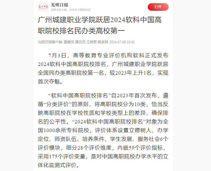7月3日,高等教育專業(yè)評價機(jī)構(gòu)軟科正式發(fā)布2024軟科中國高職院校排名,廣州城建職業(yè)學(xué)院躍居全國民辦類高職院校第一名,較2023年上升1名,實(shí)現(xiàn)首次奪魁。