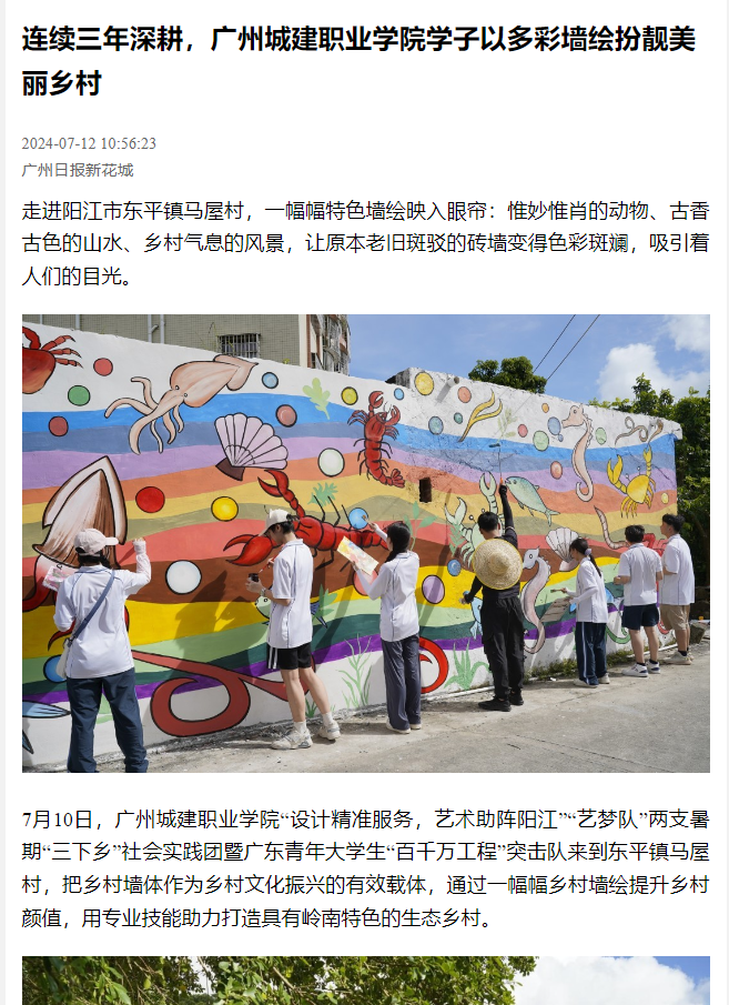 7月10日,廣州城建職業(yè)學院“設(shè)計精準服務(wù),藝術(shù)助陣陽江”“藝夢隊”兩支暑期“三下鄉(xiāng)”社會實踐團暨廣東青年大學生“百千萬工程”突擊隊來到東平鎮(zhèn)馬屋村,把鄉(xiāng)村墻體作為鄉(xiāng)村文化振興的有效載體,通過一幅幅鄉(xiāng)村墻繪提升鄉(xiāng)村顏值,用專業(yè)技能助力打造具有嶺南特色的生態(tài)鄉(xiāng)村。