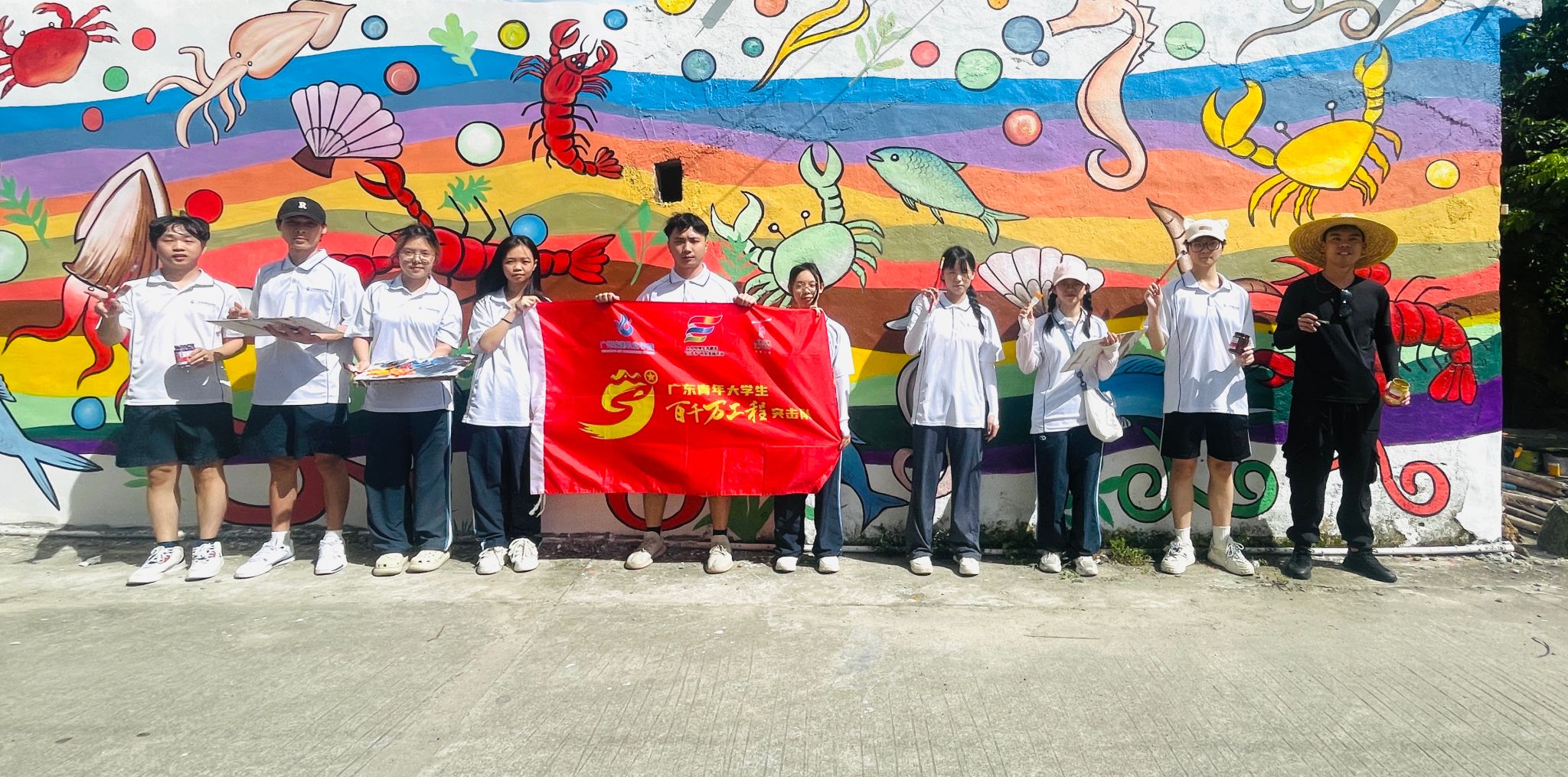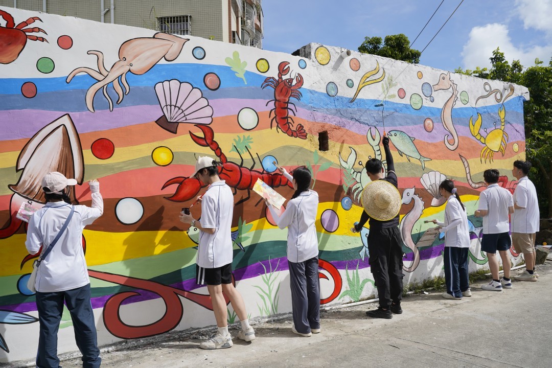 馬屋村周邊群山環(huán)繞、風(fēng)景秀麗,老師帶著學(xué)生們手持畫筆和顏料,在墻體上有條不紊進行作畫,并用調(diào)好的顏料進行涂繪。經(jīng)過精心創(chuàng)作,海蝦、魷魚、海螺等栩栩如生的海洋生物躍然“墻”上。