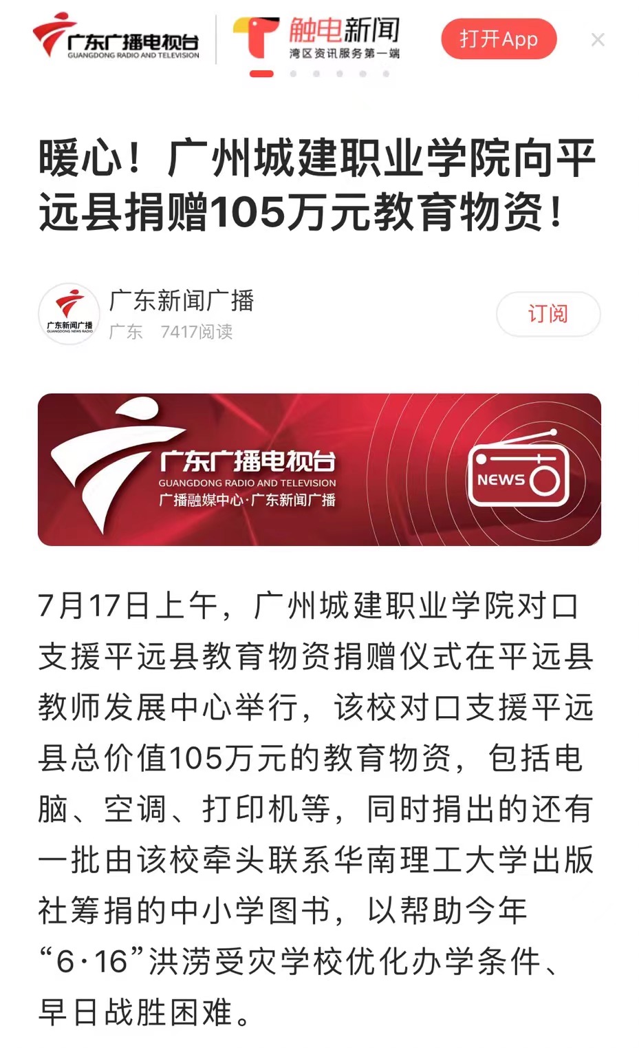 7月17日上午,廣州城建職業(yè)學(xué)院對(duì)口支援平遠(yuǎn)縣教育物資捐贈(zèng)儀式在平遠(yuǎn)縣教師發(fā)展中心舉行,該校對(duì)口支援平遠(yuǎn)縣總價(jià)值105萬(wàn)元的教育物資,包括電腦、空調(diào)、打印機(jī)等,同時(shí)捐出的還有一批由該校牽頭聯(lián)系華南理工大學(xué)出版社籌捐的中小學(xué)圖書(shū),以幫助今年“6·16”洪澇受災(zāi)學(xué)校優(yōu)化辦學(xué)條件、早日戰(zhàn)勝困難。