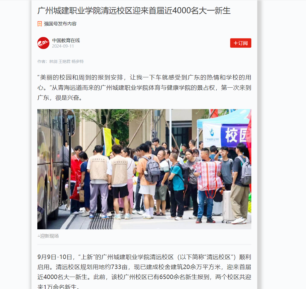 9月9日-10日,“上新”的廣州城建職業(yè)學(xué)院清遠(yuǎn)校區(qū)(以下簡稱“清遠(yuǎn)校區(qū)”)順利啟用。清遠(yuǎn)校區(qū)規(guī)劃用地約733畝,現(xiàn)已建成校舍建筑20余萬平方米,迎來首屆近4000名大一新生。此前,該校廣州校區(qū)已有6500余名新生報(bào)到,兩個(gè)校區(qū)共迎來1萬余名新生。