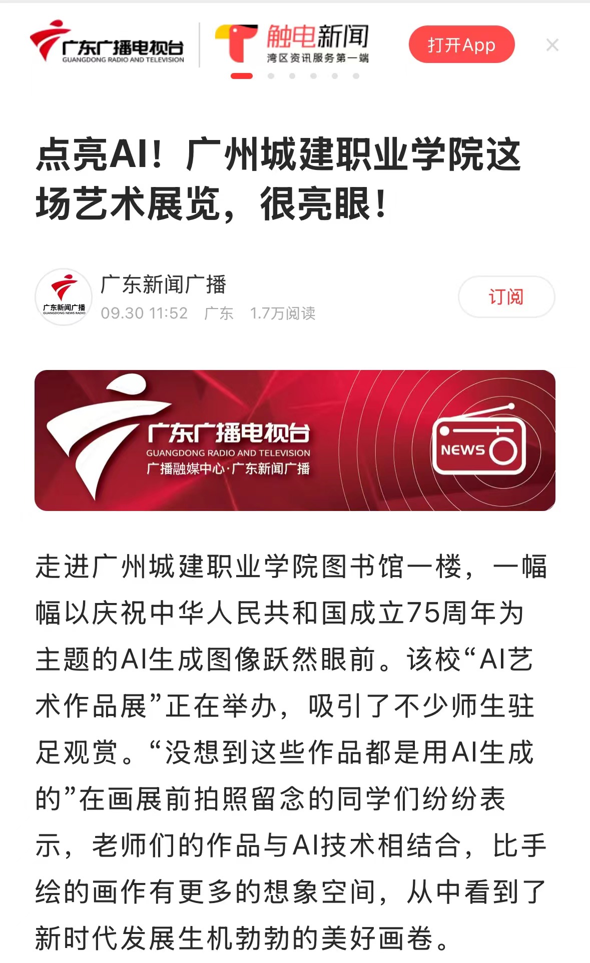 此次AI藝術(shù)作品展和紅色建筑作品展都屬于廣州城建職業(yè)學(xué)院慶祝中華人民共和國成立75周年系列活動(dòng)。此前,該校已開展了紅色經(jīng)典誦讀大賽、歌詠活動(dòng)、“手抄報(bào)”大賽等活動(dòng),旨在引導(dǎo)全校師生共抒愛國情懷,積極展示新時(shí)代青年昂揚(yáng)向上的精神面貌和對(duì)新中國成立75周年的美好祝福。