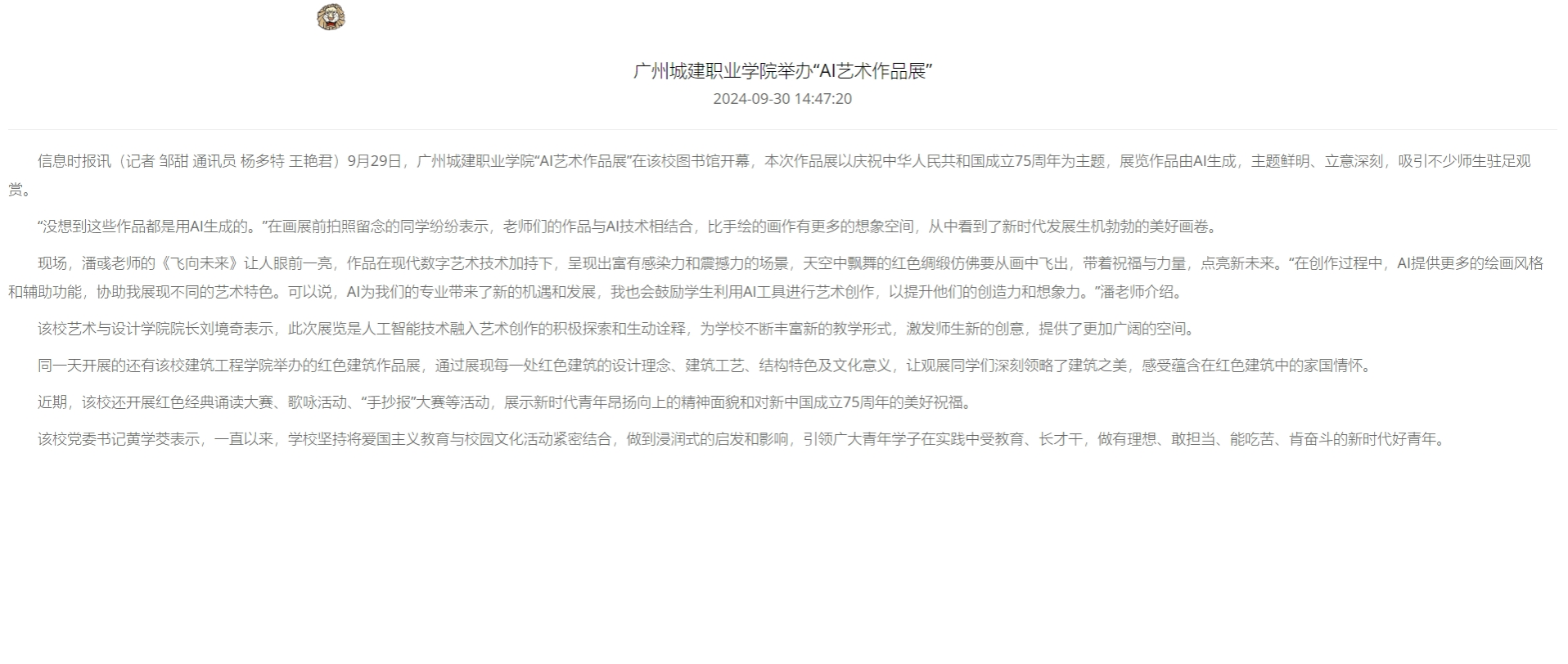 9月29日,廣州城建職業(yè)學院“AI藝術(shù)作品展”在該校圖書館開幕,本次作品展以慶祝中華人民共和國成立75周年為主題,展覽作品由AI生成,主題鮮明、立意深刻,吸引不少師生駐足觀賞。