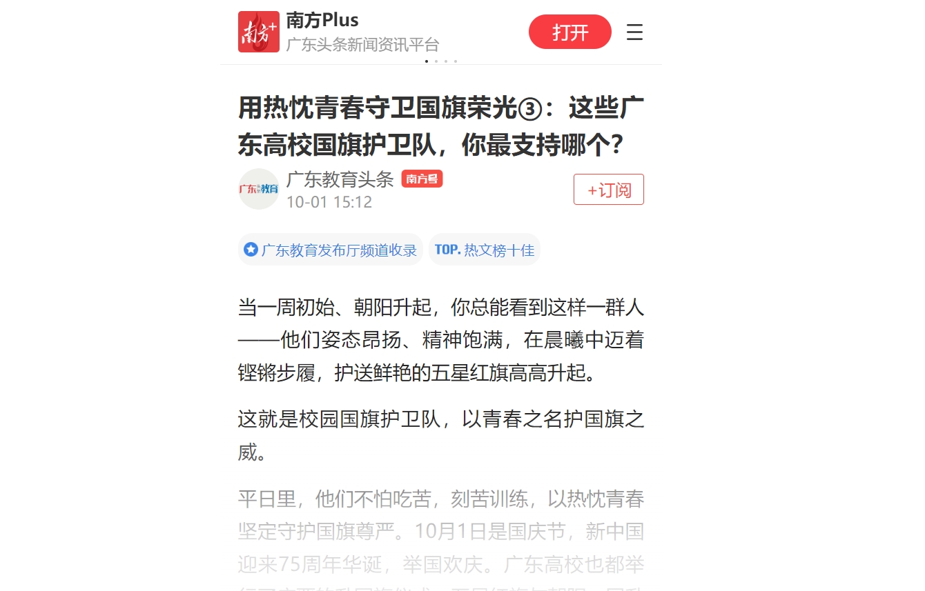平日里,他們不怕吃苦,刻苦訓(xùn)練,以熱忱青春堅定守護國旗尊嚴。10月1日是國慶節(jié),新中國迎來75周年華誕,舉國歡慶。廣東高校也都舉行了莊嚴的升國旗儀式,五星紅旗與朝陽一同升起。