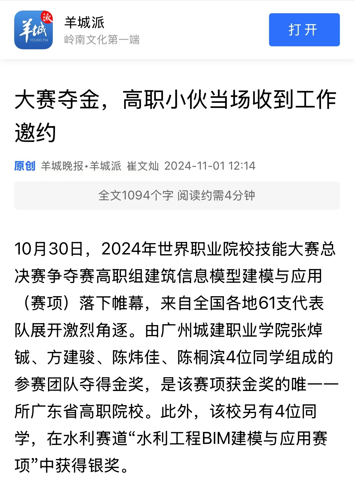 10月30日,2024年世界職業(yè)院校技能大賽總決賽爭奪賽高職組建筑信息模型建模與應(yīng)用(賽項)落下帷幕,來自全國各地61支代表隊展開激烈角逐。由廣州城建職業(yè)學(xué)院張焯鋮、方建駿、陳煒佳、陳桐濱4位同學(xué)組成的參賽團(tuán)隊奪得金獎,是該賽項獲金獎的唯一一所廣東省高職院校。此外,該校另有4位同學(xué),在水利賽道“水利工程BIM建模與應(yīng)用賽項”中獲得銀獎。