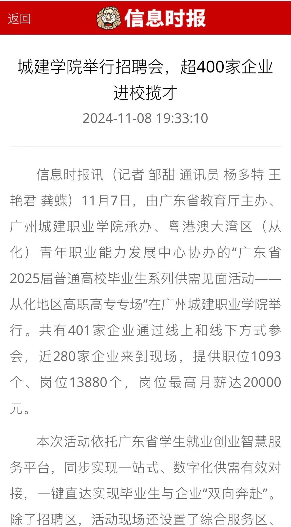 11月7日,由廣東省教育廳主辦、廣州城建職業(yè)學(xué)院承辦、粵港澳大灣區(qū)(從化)青年職業(yè)能力發(fā)展中心協(xié)辦的“廣東省2025屆普通高校畢業(yè)生系列供需見面活動——從化地區(qū)高職高專專場”在廣州城建職業(yè)學(xué)院舉行。共有401家企業(yè)通過線上和線下方式參會,近280家企業(yè)來到現(xiàn)場,提供職位1093個、崗位13880個,崗位最高月薪達(dá)20000元。