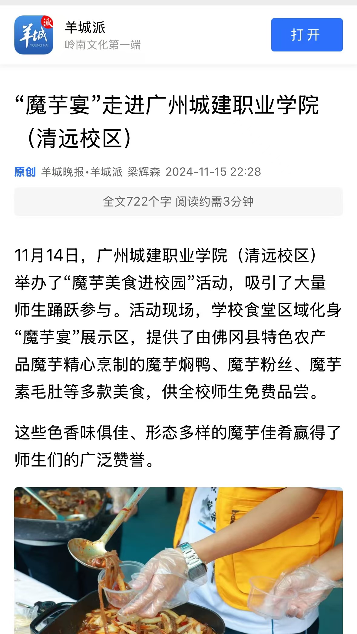 11月14日,廣州城建職業(yè)學(xué)院(清遠(yuǎn)校區(qū))舉辦了“魔芋美食進(jìn)校園”活動(dòng),吸引了大量師生踴躍參與。活動(dòng)現(xiàn)場(chǎng),學(xué)校食堂區(qū)域化身“魔芋宴”展示區(qū),提供了由佛岡縣特色農(nóng)產(chǎn)品魔芋精心烹制的魔芋燜鴨、魔芋粉絲、魔芋素毛肚等多款美食,供全校師生免費(fèi)品嘗。