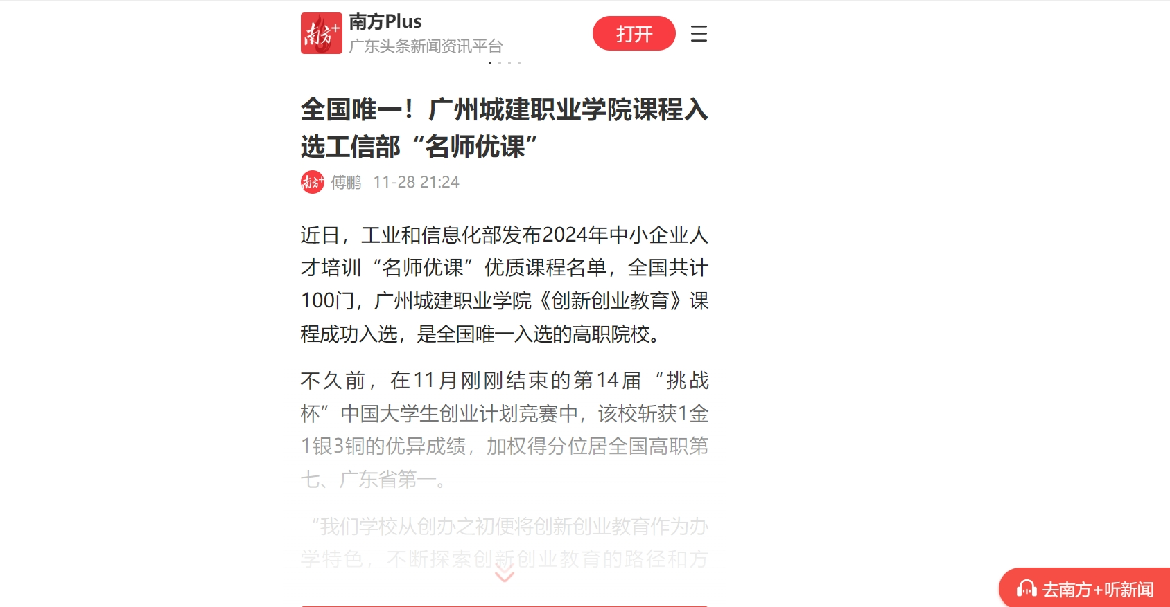 近日,工業(yè)和信息化部發(fā)布2024年中小企業(yè)人才培訓“名師優(yōu)課”優(yōu)質(zhì)課程名單,全國共計100門,廣州城建職業(yè)學院《創(chuàng)新創(chuàng)業(yè)教育》課程成功入選,是全國唯一入選的高職院校。