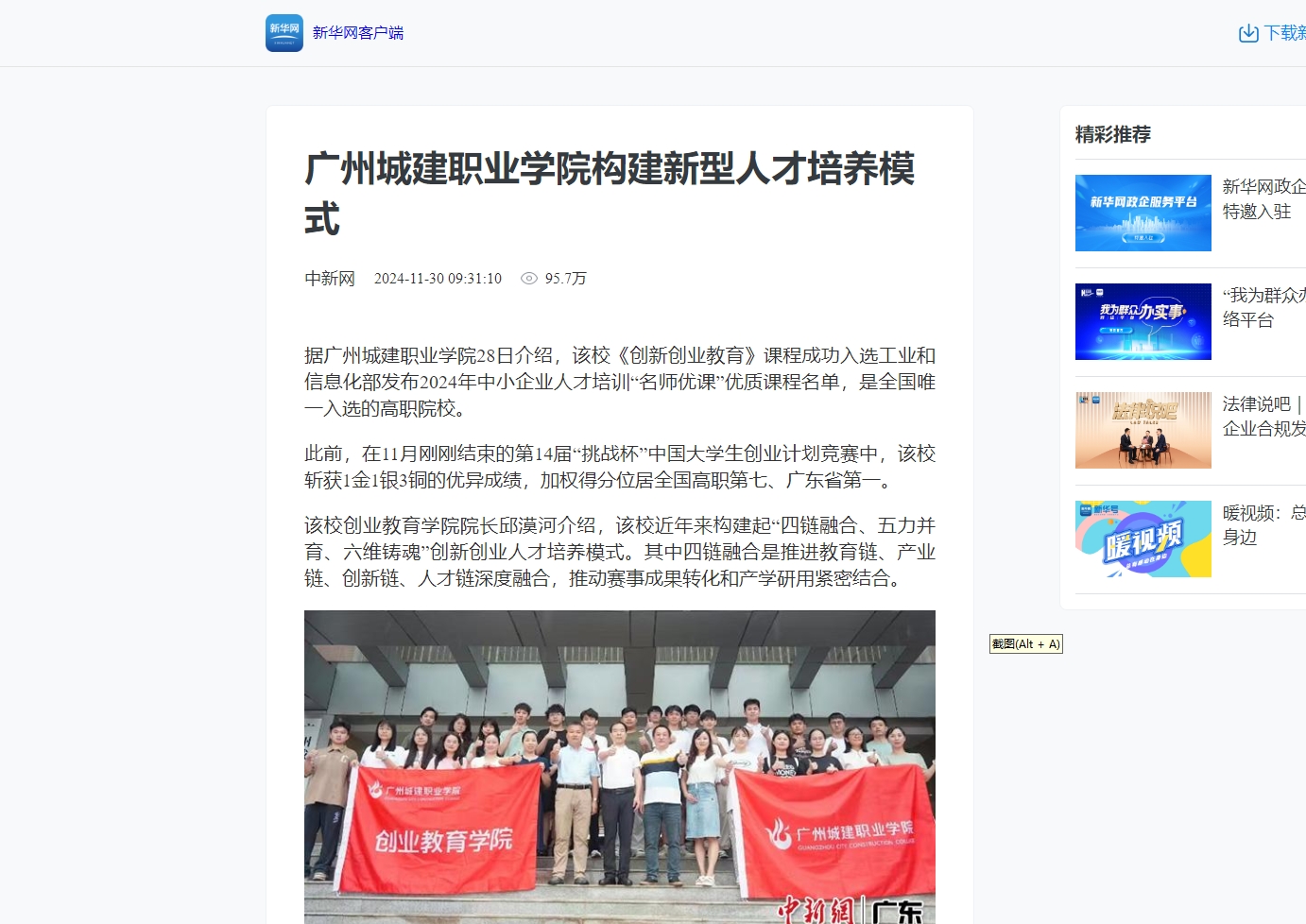 據(jù)廣州城建職業(yè)學(xué)院28日介紹,該?!秳?chuàng)新創(chuàng)業(yè)教育》課程成功入選工業(yè)和信息化部發(fā)布2024年中小企業(yè)人才培訓(xùn)“名師優(yōu)課”優(yōu)質(zhì)課程名單,是全國(guó)唯一入選的高職院校。