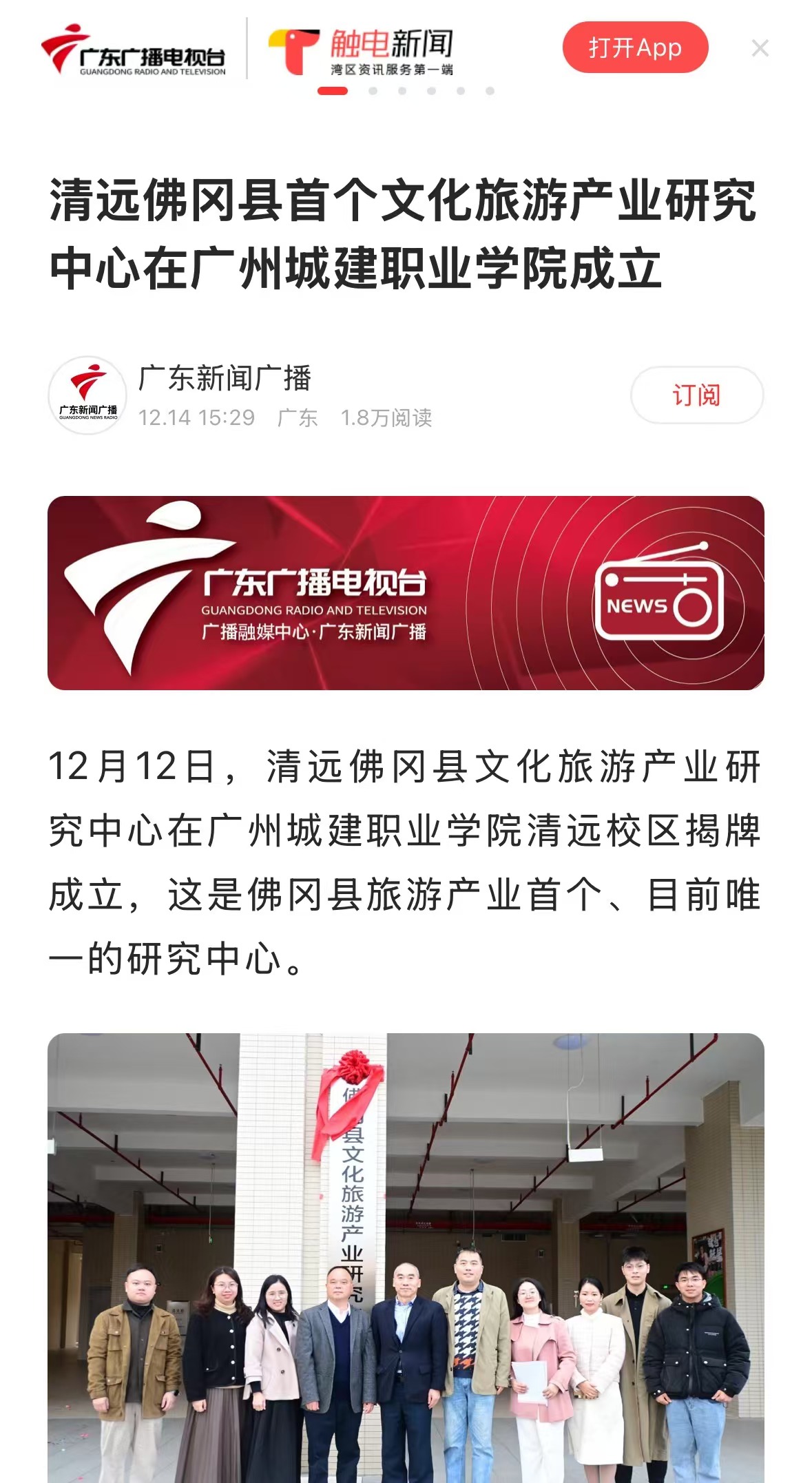 12月12日,清遠(yuǎn)佛岡縣文化旅游產(chǎn)業(yè)研究中心在廣州城建職業(yè)學(xué)院清遠(yuǎn)校區(qū)揭牌成立,這是佛岡縣旅游產(chǎn)業(yè)首個(gè)、目前唯一的研究中心。