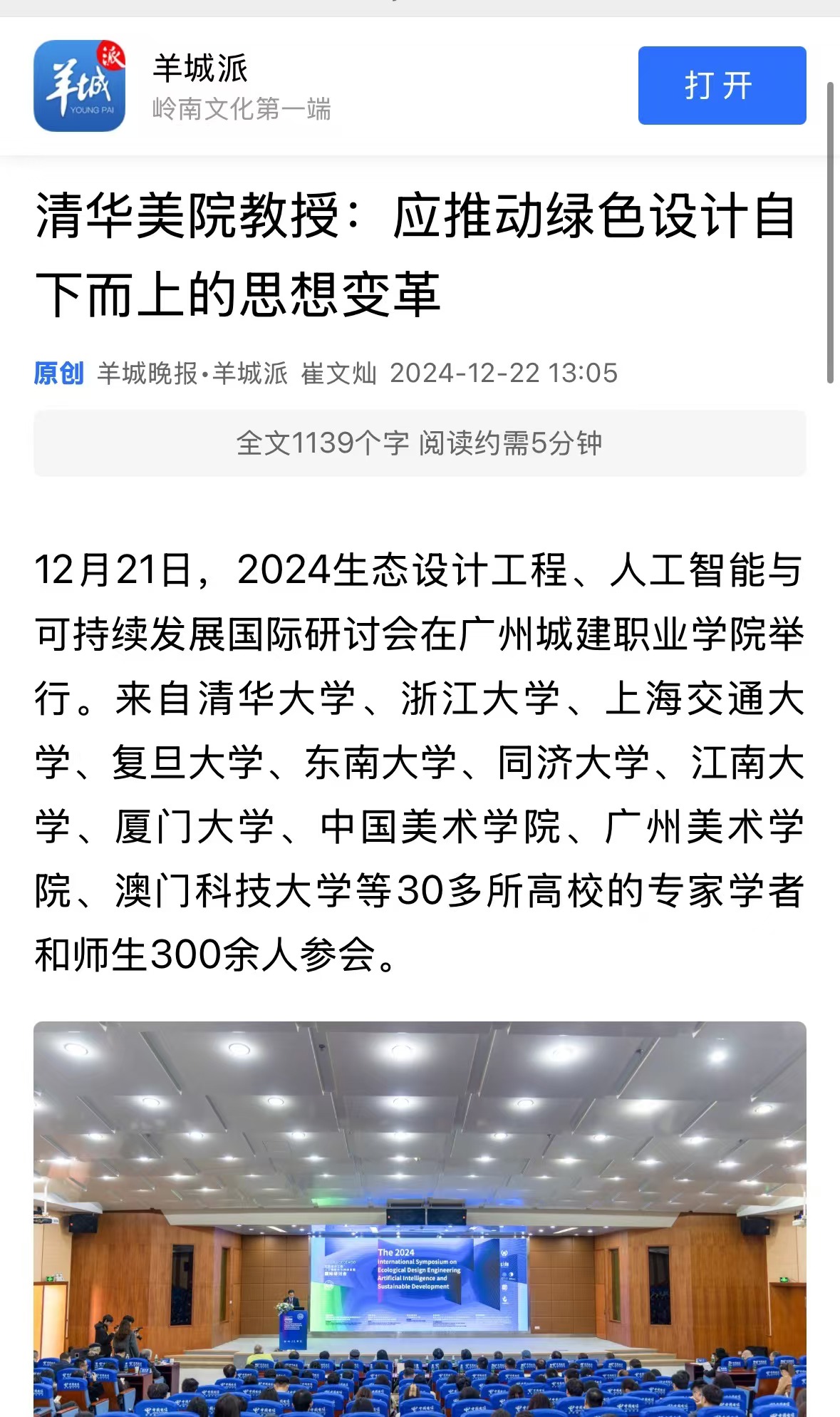 12月21日,2024生態(tài)設(shè)計(jì)工程、人工智能與可持續(xù)發(fā)展國際研討會在廣州城建職業(yè)學(xué)院舉行。來自清華大學(xué)、浙江大學(xué)、上海交通大學(xué)、復(fù)旦大學(xué)、東南大學(xué)、同濟(jì)大學(xué)、江南大學(xué)、廈門大學(xué)、中國美術(shù)學(xué)院、廣州美術(shù)學(xué)院、澳門科技大學(xué)等30多所高校的專家學(xué)者和師生300余人參會。
