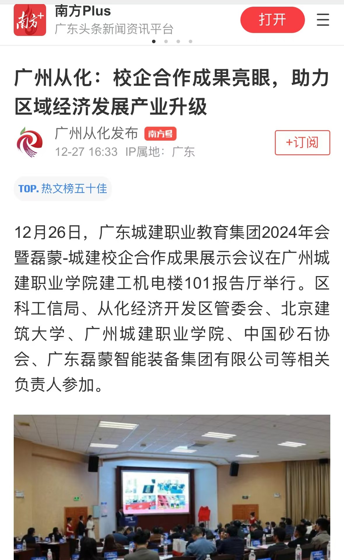 12月26日,廣東城建職業(yè)教育集團(tuán)2024年會(huì)暨磊蒙-城建校企合作成果展示會(huì)議在廣州城建職業(yè)學(xué)院建工機(jī)電樓101報(bào)告廳舉行。區(qū)科工信局、從化經(jīng)濟(jì)開發(fā)區(qū)管委會(huì)、北京建筑大學(xué)、廣州城建職業(yè)學(xué)院、中國(guó)砂石協(xié)會(huì)、廣東磊蒙智能裝備集團(tuán)有限公司等相關(guān)負(fù)責(zé)人參加。
