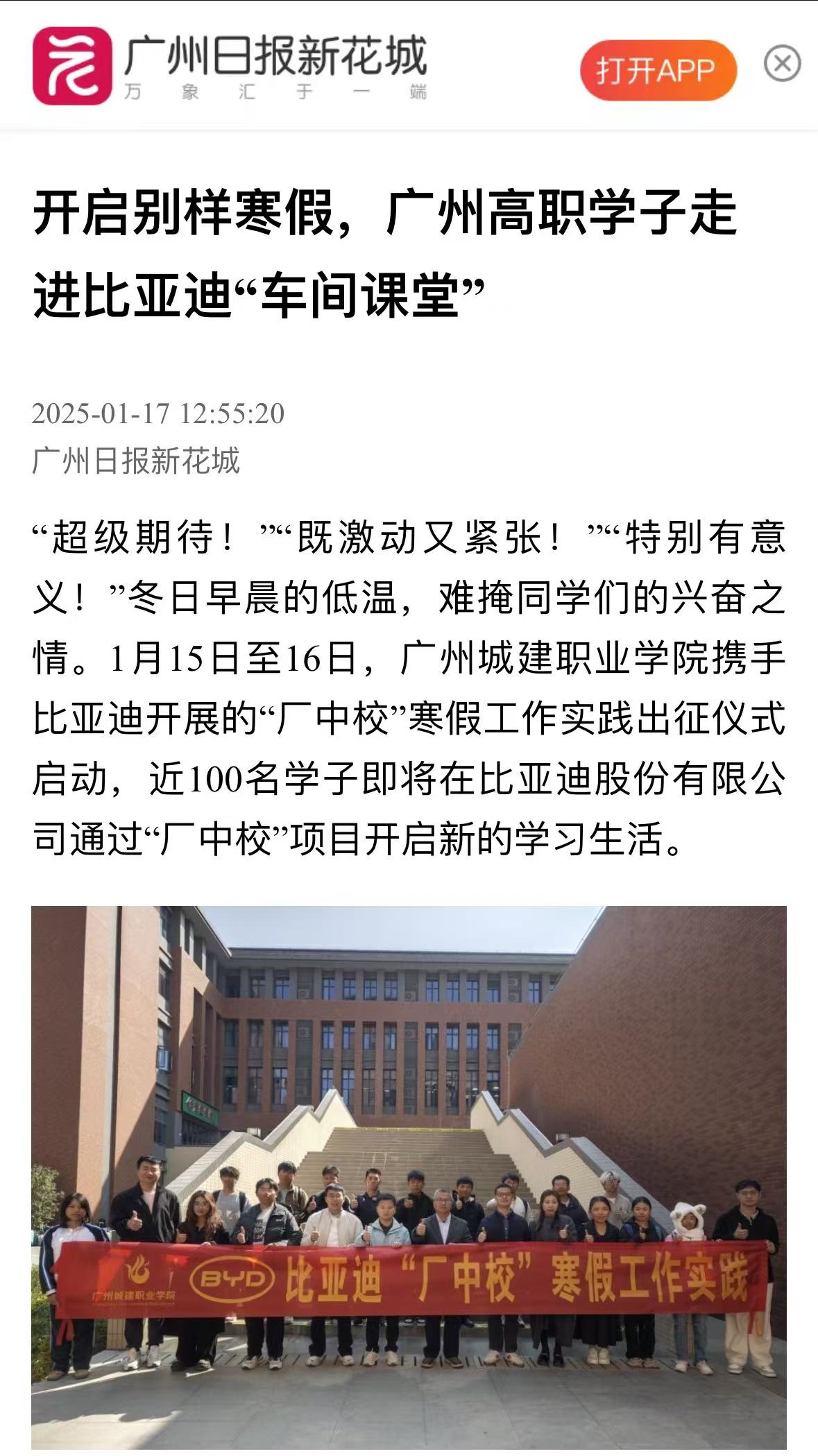 此前,該校舉辦了比亞迪企業(yè)文化進校園活動,宣講覆蓋全體大一、大二在校學生。報名參與寒假工作實踐的學生有近300人?!澳苓M入大廠實習,對我來說既是鍛煉也是成長,不僅學到新能源領域的知識,還可以體驗企業(yè)文化,更是為未來就業(yè)打下基礎。”2023級新能源試點班葉想同學說。