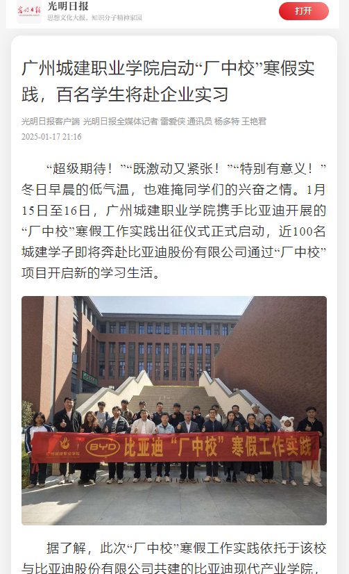 “超級期待!”“既激動又緊張!”“特別有意義!”冬日早晨的低氣溫,也難掩同學們的興奮之情。1月15日至16日,廣州城建職業(yè)學院攜手比亞迪開展的“廠中校”寒假工作實踐出征儀式正式啟動,近100名城建學子即將奔赴比亞迪股份有限公司通過“廠中校”項目開啟新的學習生活。