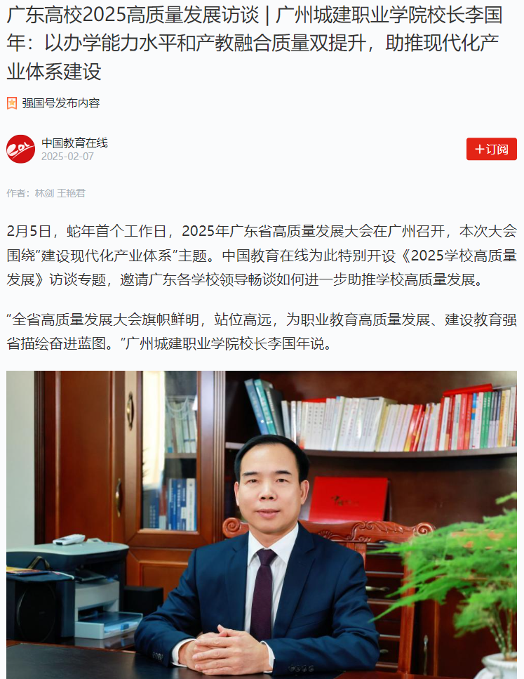 2月5日,蛇年首個工作日,2025年廣東省高質(zhì)量發(fā)展大會在廣州召開,本次大會圍繞“建設現(xiàn)代化產(chǎn)業(yè)體系”主題。中國教育在線為此特別開設《2025學校高質(zhì)量發(fā)展》訪談專題,邀請廣東各學校領(lǐng)導暢談如何進一步助推學校高質(zhì)量發(fā)展。