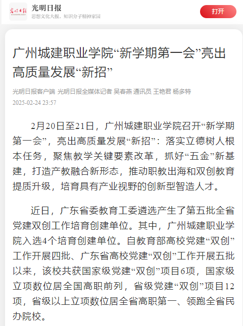 2月20日至21日,廣州城建職業(yè)學(xué)院召開“新學(xué)期第一會(huì)”,亮出高質(zhì)量發(fā)展“新招”:落實(shí)立德樹人根本任務(wù),聚焦教學(xué)關(guān)鍵要素改革,抓好“五金”新基建,打造產(chǎn)教融合新形態(tài),推動(dòng)職教出海和雙創(chuàng)教育提質(zhì)升級(jí),培育具有產(chǎn)業(yè)視野的創(chuàng)新型智造人才。