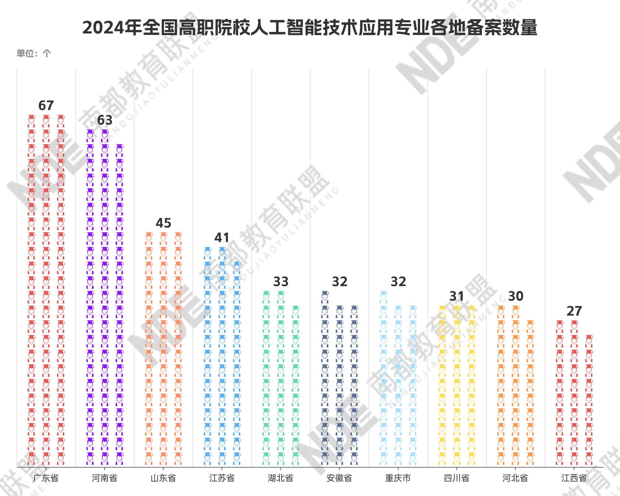 此后,這一數(shù)字不斷飆升,截至2024年,共有627條高職院校人工智能技術(shù)應(yīng)用專業(yè)備案記錄。從地域分布來(lái)看,廣東省數(shù)量最多,共有67條,包含2年制和3年制,公辦院校和民辦院校均有覆蓋,其次為河南省63條、山東省45條、江蘇省41條。