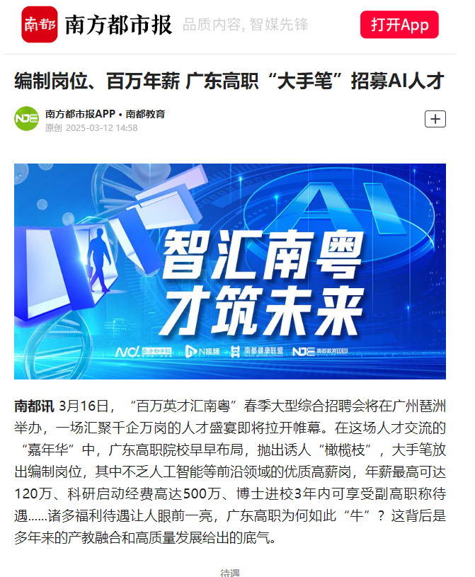 3月16日,“百萬(wàn)英才匯南粵”春季大型綜合招聘會(huì)將在廣州琶洲舉辦,一場(chǎng)匯聚千企萬(wàn)崗的人才盛宴即將拉開(kāi)帷幕。在這場(chǎng)人才交流的“嘉年華”中,廣東高職院校早早布局,拋出誘人“橄欖枝”,大手筆放出編制崗位,其中不乏人工智能等前沿領(lǐng)域的優(yōu)質(zhì)高薪崗,年薪最高可達(dá)120萬(wàn)、科研啟動(dòng)經(jīng)費(fèi)高達(dá)500萬(wàn)、博士進(jìn)校3年內(nèi)可享受副高職稱待遇......諸多福利待遇讓人眼前一亮,廣東高職為何如此“?!??這背后是多年來(lái)的產(chǎn)教融合和高質(zhì)量發(fā)展給出的底氣。