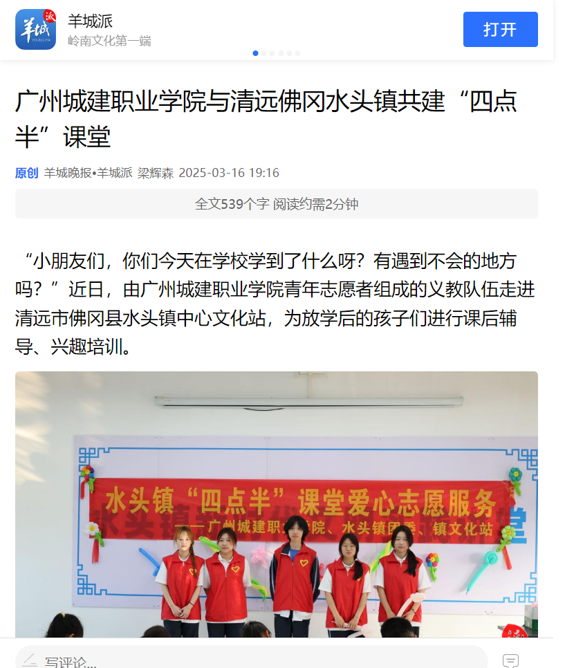 據(jù)介紹,此次“四點(diǎn)半課堂”也是廣州城建職業(yè)學(xué)院學(xué)子服務(wù)基層的生動(dòng)實(shí)踐。后續(xù),團(tuán)隊(duì)將依據(jù)水頭鎮(zhèn)居民實(shí)際需求,持續(xù)優(yōu)化課程內(nèi)容,嚴(yán)格篩選志愿者,不斷提升服務(wù)質(zhì)量,致力于將該項(xiàng)目打造成可持續(xù)、可復(fù)制的校社合作典范。