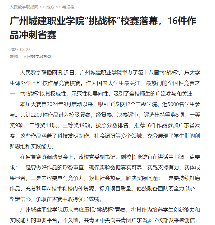人民數(shù)字聯(lián)播網(wǎng)訊 近日,廣州城建職業(yè)學(xué)院舉辦了第十八屆“挑戰(zhàn)杯”廣東大學(xué)生課外學(xué)術(shù)科技作品競(jìng)賽校賽。作為國(guó)內(nèi)大學(xué)生最關(guān)注、最熱門的全國(guó)性競(jìng)賽之一,“挑戰(zhàn)杯”以其權(quán)威性、示范性和導(dǎo)向性,吸引了全校師生的廣泛參與和關(guān)注。