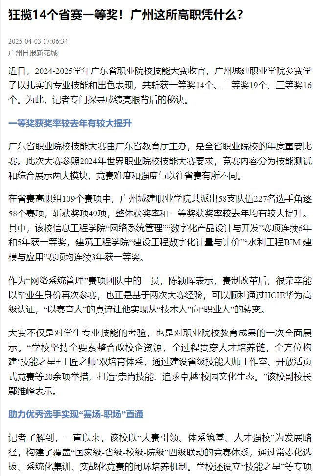 近日,2024-2025學(xué)年廣東省職業(yè)院校技能大賽收官,廣州城建職業(yè)學(xué)院參賽學(xué)子以扎實的專業(yè)技能和出色表現(xiàn),共斬獲一等獎14個、二等獎19個、三等獎16個。為此,記者專門探尋成績亮眼背后的秘訣。