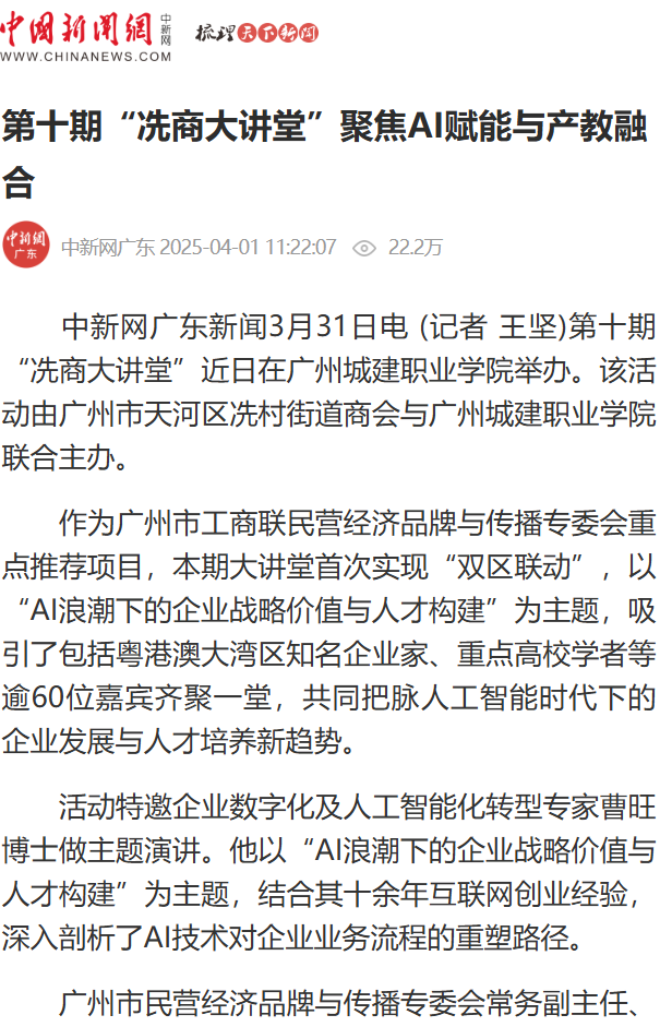 廣州市民營(yíng)經(jīng)濟(jì)品牌與傳播專委會(huì)常務(wù)副主任、天河區(qū)冼村街道商會(huì)會(huì)長(zhǎng)陳治軍在專題訪談中表示,面對(duì)AI技術(shù)帶來(lái)的產(chǎn)業(yè)變革,他們正著力構(gòu)建“政產(chǎn)學(xué)研用”五位一體的青年就業(yè)聯(lián)盟。