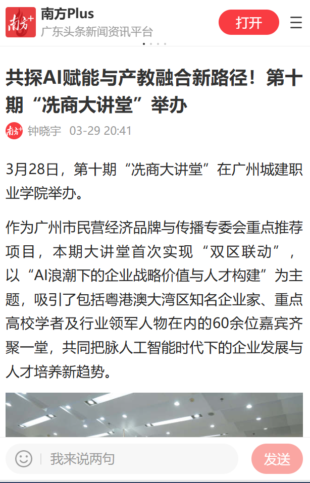 廣州市民營經(jīng)濟(jì)品牌與傳播專委會常務(wù)副主任、天河區(qū)冼村街道商會會長陳治軍在專題訪談中表示,面對AI技術(shù)帶來的產(chǎn)業(yè)變革,目前正著力構(gòu)建“政產(chǎn)學(xué)研用”五位一體的青年就業(yè)聯(lián)盟。通過精準(zhǔn)對接高校教育資源、企業(yè)用人需求與政府政策支持,打造全鏈條人才服務(wù)體系,為粵港澳大灣區(qū)建設(shè)提供強(qiáng)有力的人才支撐。