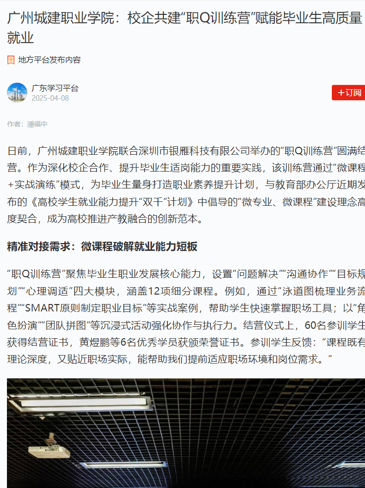 日前,廣州城建職業(yè)學(xué)院聯(lián)合深圳市銀雁科技有限公司舉辦的“職Q訓(xùn)練營(yíng)”圓滿結(jié)營(yíng)。作為深化校企合作、提升畢業(yè)生適崗能力的重要實(shí)踐,該訓(xùn)練營(yíng)通過“微課程+實(shí)戰(zhàn)演練”模式,為畢業(yè)生量身打造職業(yè)素養(yǎng)提升計(jì)劃,與教育部辦公廳近期發(fā)布的《高校學(xué)生就業(yè)能力提升“雙千”計(jì)劃》中倡導(dǎo)的“微專業(yè)、微課程”建設(shè)理念高度契合,成為高校推進(jìn)產(chǎn)教融合的創(chuàng)新范本。