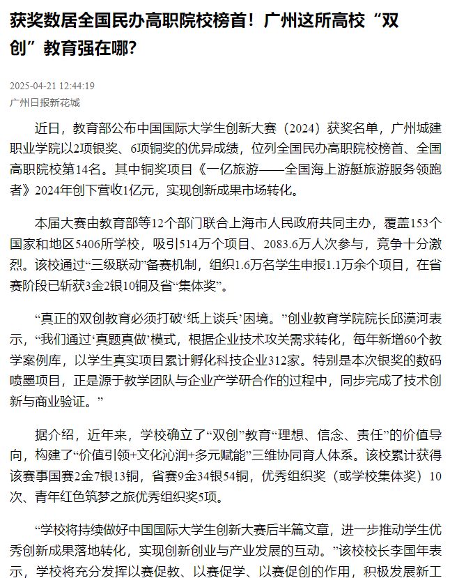 近日,教育部公布中國國際大學(xué)生創(chuàng)新大賽(2024)獲獎(jiǎng)名單,廣州城建職業(yè)學(xué)院以2項(xiàng)銀獎(jiǎng)、6項(xiàng)銅獎(jiǎng)的優(yōu)異成績,位列全國民辦高職院校榜首、全國高職院校第14名。其中銅獎(jiǎng)項(xiàng)目《一億旅游——全國海上游艇旅游服務(wù)領(lǐng)跑者》2024年創(chuàng)下營收1億元,實(shí)現(xiàn)創(chuàng)新成果市場轉(zhuǎn)化。