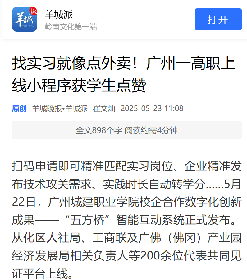 掃碼申請即可精準(zhǔn)匹配實習(xí)崗位、企業(yè)精準(zhǔn)發(fā)布技術(shù)攻關(guān)需求、實踐時長自動轉(zhuǎn)學(xué)分……5月22日,廣州城建職業(yè)學(xué)院校企合作數(shù)字化創(chuàng)新成果——“五方橋”智能互動系統(tǒng)正式發(fā)布。從化區(qū)人社局、工商聯(lián)及廣佛(佛岡)產(chǎn)業(yè)園經(jīng)濟發(fā)展局相關(guān)負(fù)責(zé)人等200余位代表共同見證平臺上線。