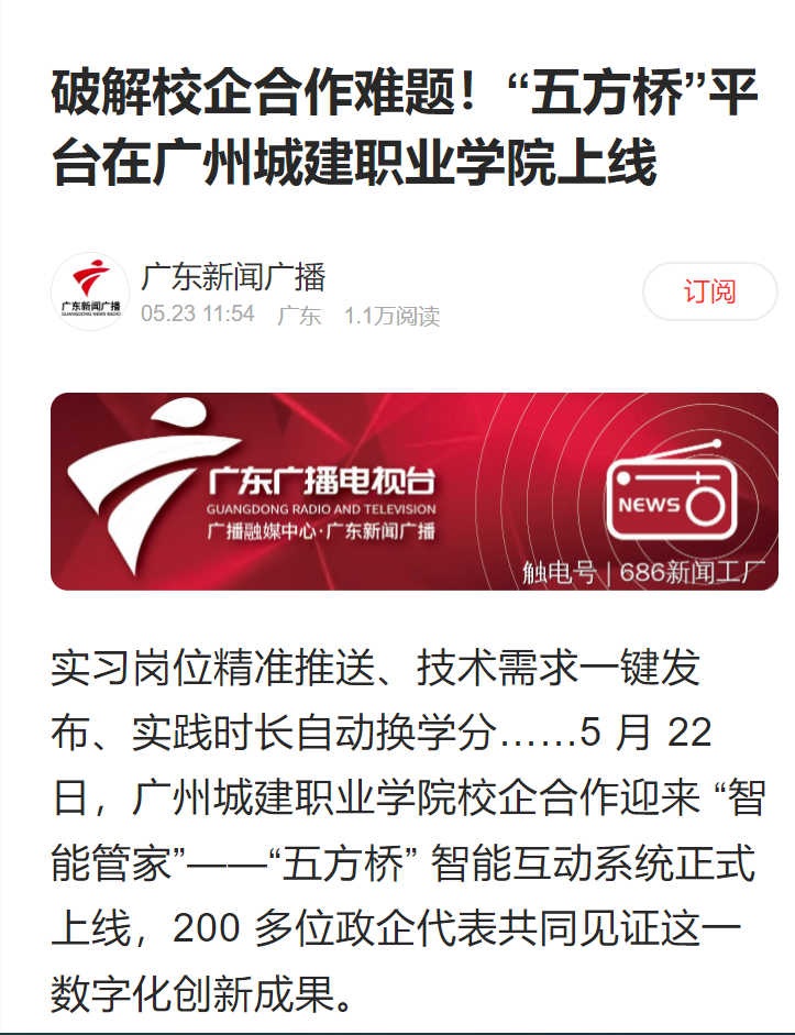 實(shí)習(xí)崗位精準(zhǔn)推送、技術(shù)需求一鍵發(fā)布、實(shí)踐時(shí)長(zhǎng)自動(dòng)換學(xué)分……5 月 22 日,廣州城建職業(yè)學(xué)院校企合作迎來(lái) “智能管家”——“五方橋” 智能互動(dòng)系統(tǒng)正式上線,200 多位政企代表共同見證這一數(shù)字化創(chuàng)新成果。