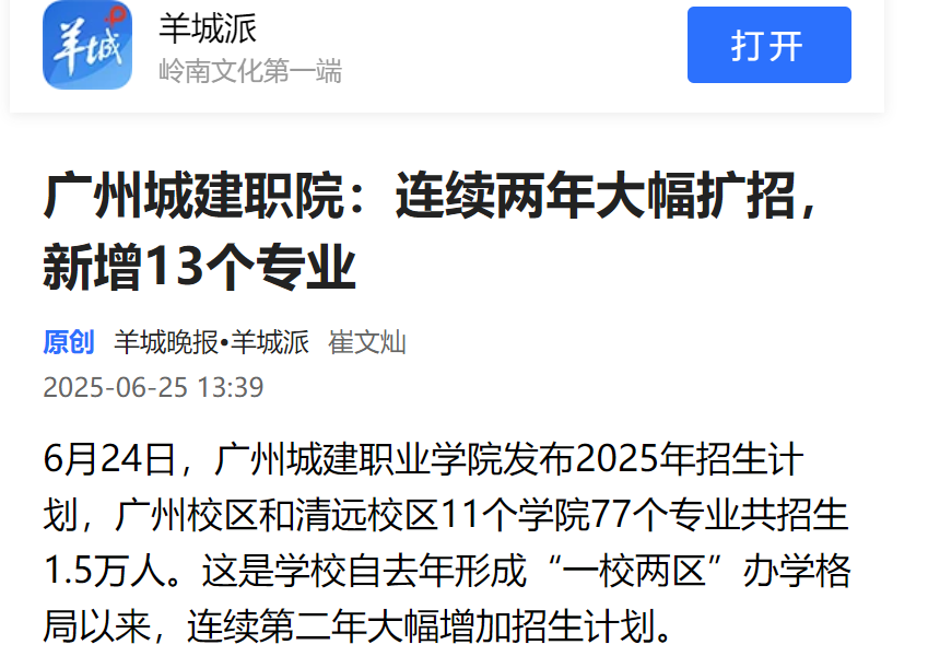 6月24日,廣州城建職業(yè)學院發(fā)布2025年招生計劃,廣州校區(qū)和清遠校區(qū)11個學院77個專業(yè)共招生1.5萬人。這是學校自去年形成“一校兩區(qū)”辦學格局以來,連續(xù)第二年大幅增加招生計劃。