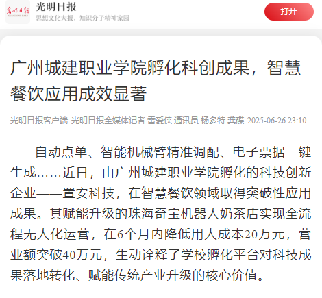 自動點單、智能機械臂精準調(diào)配、電子票據(jù)一鍵生成……近日,由廣州城建職業(yè)學(xué)院孵化的科技創(chuàng)新企業(yè)——置安科技,在智慧餐飲領(lǐng)域取得突破性應(yīng)用成果。其賦能升級的珠海奇寶機器人奶茶店實現(xiàn)全流程無人化運營,在6個月內(nèi)降低用人成本20萬元,營業(yè)額突破40萬元,生動詮釋了學(xué)校孵化平臺對科技成果落地轉(zhuǎn)化、賦能傳統(tǒng)產(chǎn)業(yè)升級的核心價值。