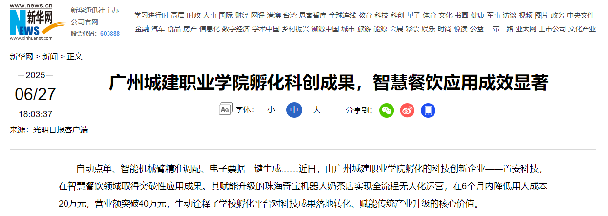 自動(dòng)點(diǎn)單、智能機(jī)械臂精準(zhǔn)調(diào)配、電子票據(jù)一鍵生成……近日,由廣州城建職業(yè)學(xué)院孵化的科技創(chuàng)新企業(yè)——置安科技,在智慧餐飲領(lǐng)域取得突破性應(yīng)用成果。其賦能升級(jí)的珠海奇寶機(jī)器人奶茶店實(shí)現(xiàn)全流程無(wú)人化運(yùn)營(yíng),在6個(gè)月內(nèi)降低用人成本20萬(wàn)元,營(yíng)業(yè)額突破40萬(wàn)元,生動(dòng)詮釋了學(xué)校孵化平臺(tái)對(duì)科技成果落地轉(zhuǎn)化、賦能傳統(tǒng)產(chǎn)業(yè)升級(jí)的核心價(jià)值。