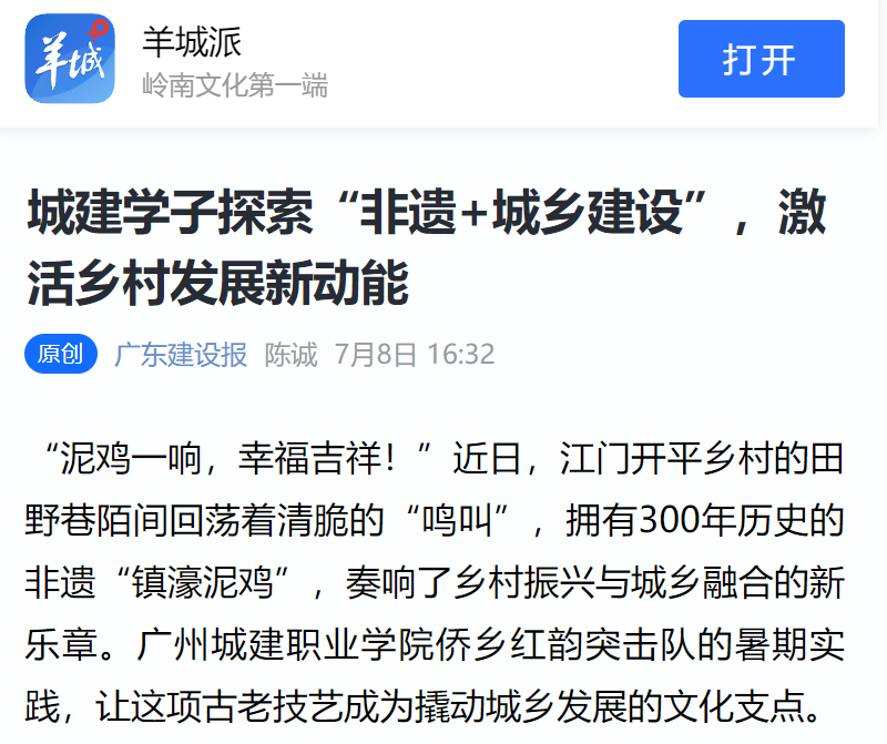“泥雞一響,幸福吉祥!”近日,江門開(kāi)平鄉(xiāng)村的田野巷陌間回蕩著清脆的“鳴叫”,擁有300年歷史的非遺“鎮(zhèn)濠泥雞”,奏響了鄉(xiāng)村振興與城鄉(xiāng)融合的新樂(lè)章。廣州城建職業(yè)學(xué)院僑鄉(xiāng)紅韻突擊隊(duì)的暑期實(shí)踐,讓這項(xiàng)古老技藝成為撬動(dòng)城鄉(xiāng)發(fā)展的文化支點(diǎn)。